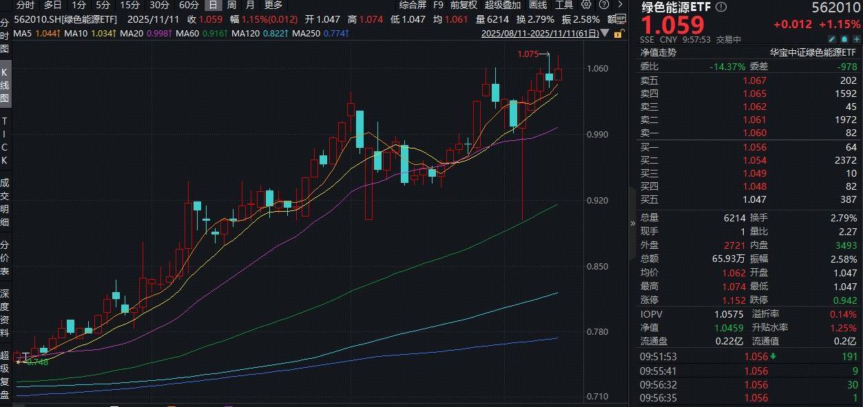 今日(11月11日)电力设备板块领涨两市,全市场唯一一只跟踪绿色能源指数的绿色能源ETF(562010)场内价格一度涨超2.2%,现涨1.15%,当前站在所有均线上方鼎豪投资,技术面上行动能较强。