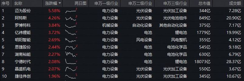成份股方面,迈为股份涨超5%,阿特斯涨逾4%,罗伯特科、亿纬锂能、明阳智能、宁德时代等个股跟涨!
